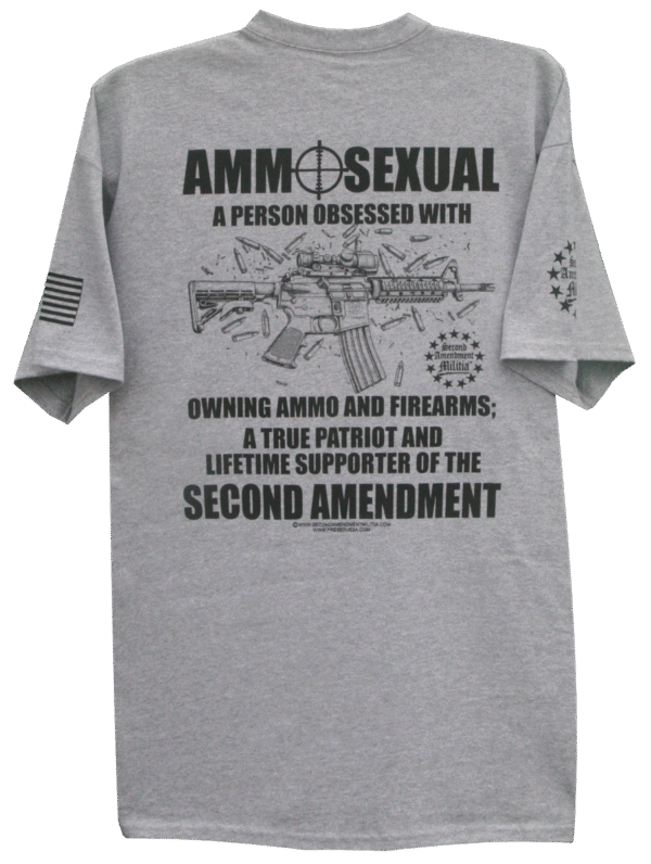 This outrageous T-Shirt is sure to get a lot of attention! We can bet than you never considered that your obsession with Guns and Ammo as well as your passion for the Second Amendment would lead you to be called an AmmoSexual! But it’s not a bad thing, and as Jerry Seinfeld might say: “Not that there’s anything wrong with that”! This T-Shirt defines an AmmoSexual as: “A PERSON OBSESSED WITH OWNING AMMO AND FIREARMS; A TRUE PATRIOT AND LIFETIME SUPPORTER OF THE SECOND AMENDMENT”. Enjoy wearing this outrageous T-Shirt, and watch for people’s reaction. This would make a great gag gift to the “Gun Nut” in your life.