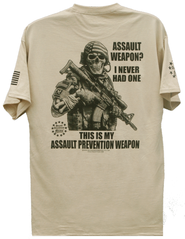 So this t-shirt makes light of this fact, and makes the typical AR an “ASSAULT PREVENTION WEAPON”. Hence the quote on our T-Shirt: “ASSAULT WEAPON? I NEVER HAD ONE. THIS IS MY ASSAULT PREVENTION WEAPON”. Fans of the AR, and the Second Amendment, will certainly love this T-Shirt.