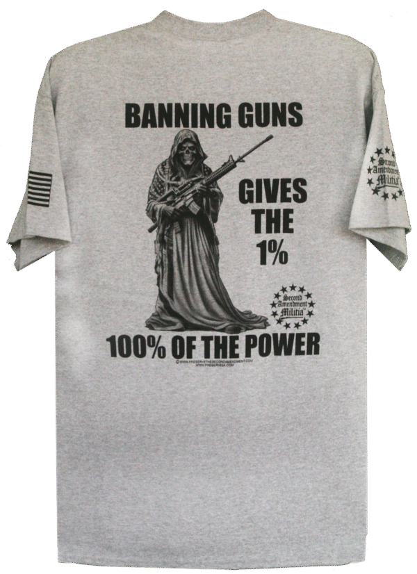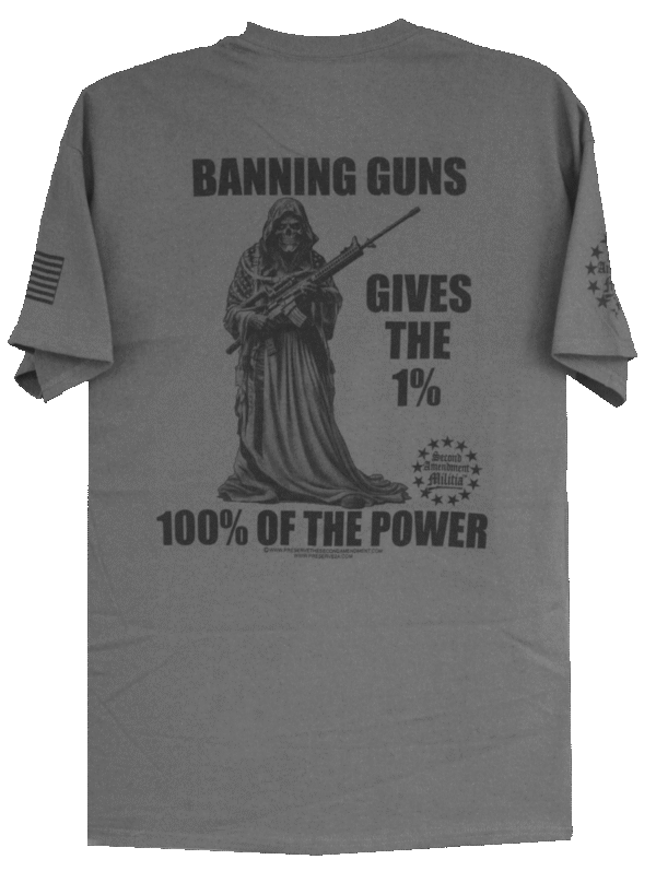 This design features our Skeleton Grimm Reaper draped in a stars and stripes cape carrying an AR style rifle. The quote reads: “BANNING GUNS GIVES THE 1%, 100% OF THE POWER”. The Grimm Reaper in this case represents a Tyrannical Government (or perhaps any orgnization of power, criminals, etc.). By banning guns, you have disarmed the people. Now only the 1% (the tyrannical Government or other Evil Forces) have the guns and are also now free to take away Freedom, Rights, and Liberty from the disarmed population. Never allow our Second Amendment rights to be taken away, no matter what promises the government might make. Every small advancement in the disarming of the people is a step towards the governments ultimate goal of the total disarming of America.