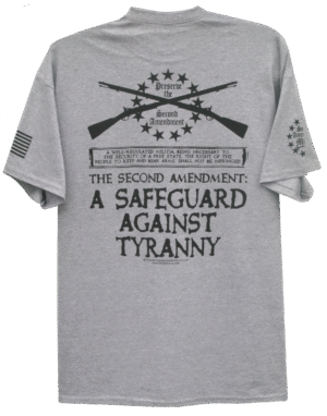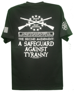 - PRINTED IN FOUR LOCATIONS: FRONT, BACK, AND BOTH SLEEVES, (PLUS A PRINTED NECK LABEL FOR COMFORT, FEATURING THE SECOND AMENDMENT MILITIA LOGO)