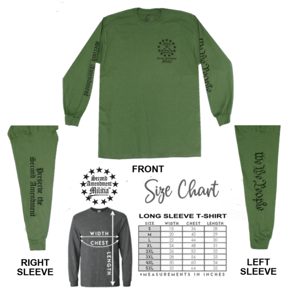 - Printed in Four Locations: Front, Back, and Both Sleeves, plus a printed neck label featuring the Second Amendment Militia logo.