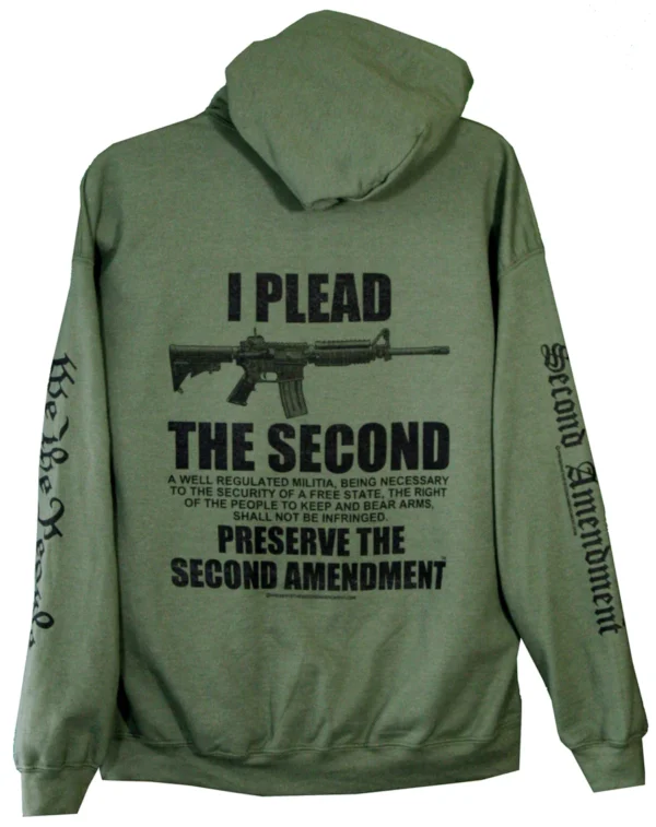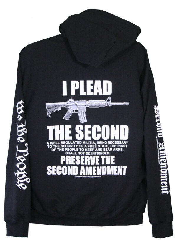 Don’t Plead the the Fifth, PLEAD THE SECOND!!! This Hoodie makes a great statement. Flex your Second Amendment rights! The graphic displays our original drawing of an AR-15 rifle, and it is paired with the quote: “I PLEAD THE SECOND”. That is followed by the entire wording of the Second Amendment, and below that it says proudly: “PRESERVE THE SECOND AMENDMENT”. Down the left sleeve is written: “WE THE PEOPLE”, and down the right sleeve is written: “PRESERVE THE SECOND AMENDMENT”. Any supporter of the Second Ammendment, Freedom, and Liberty is sure to love this Hoodie.