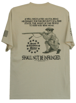 - Printed in Four Locations: Front, Back, and Both Sleeves, plus there is a printed neck tag for comfort which features the Second Amendment Militia Logo..