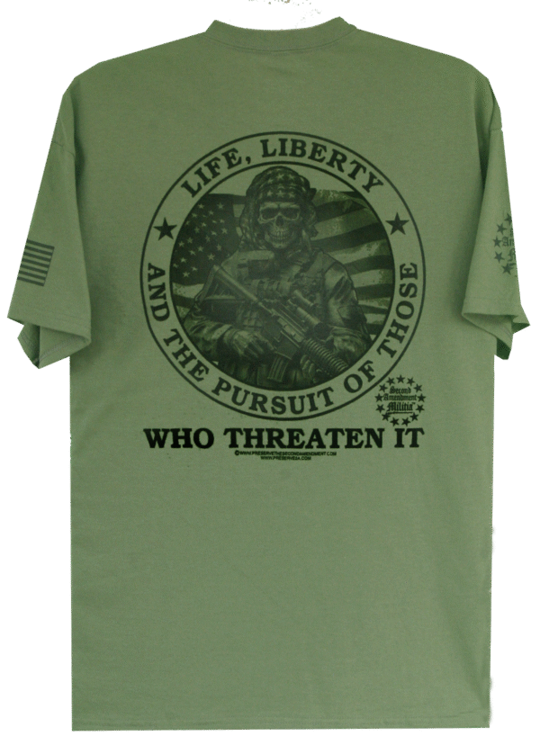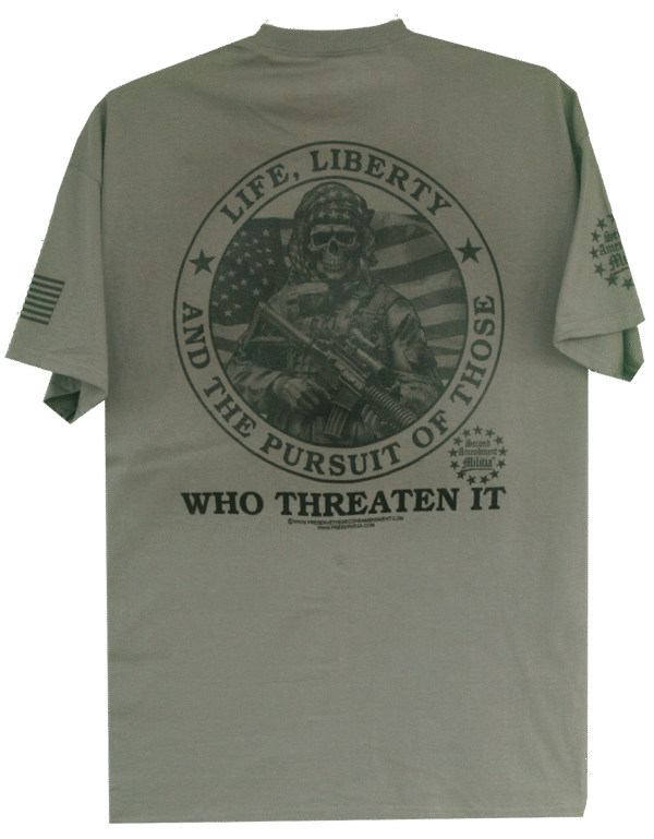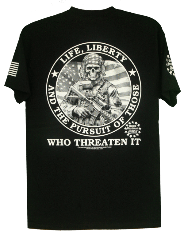 - Printed in 4 locations: Front left chest, back, and both sleeves, plus a printed neck label for comfort and features the Second Amendment Militia logo.