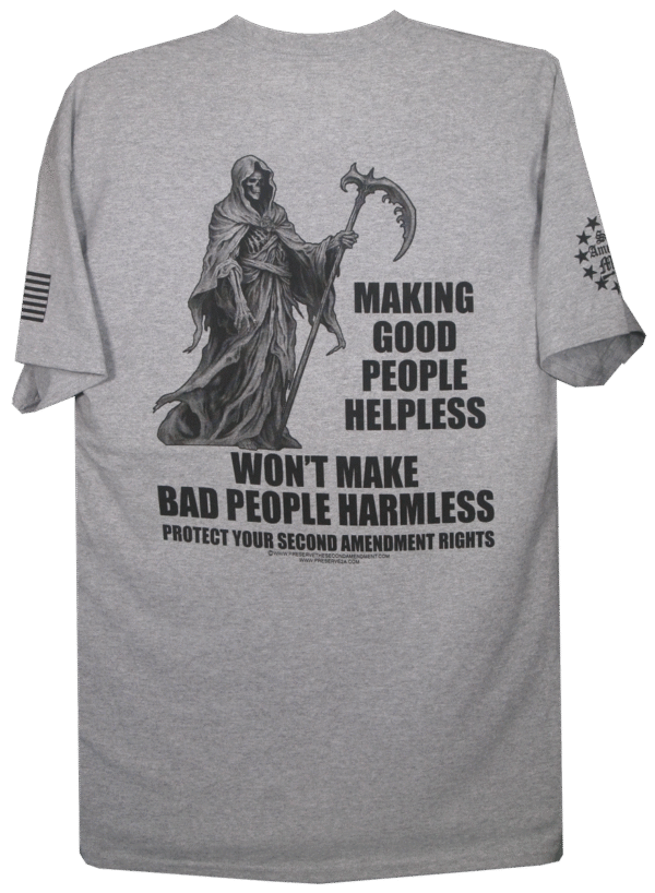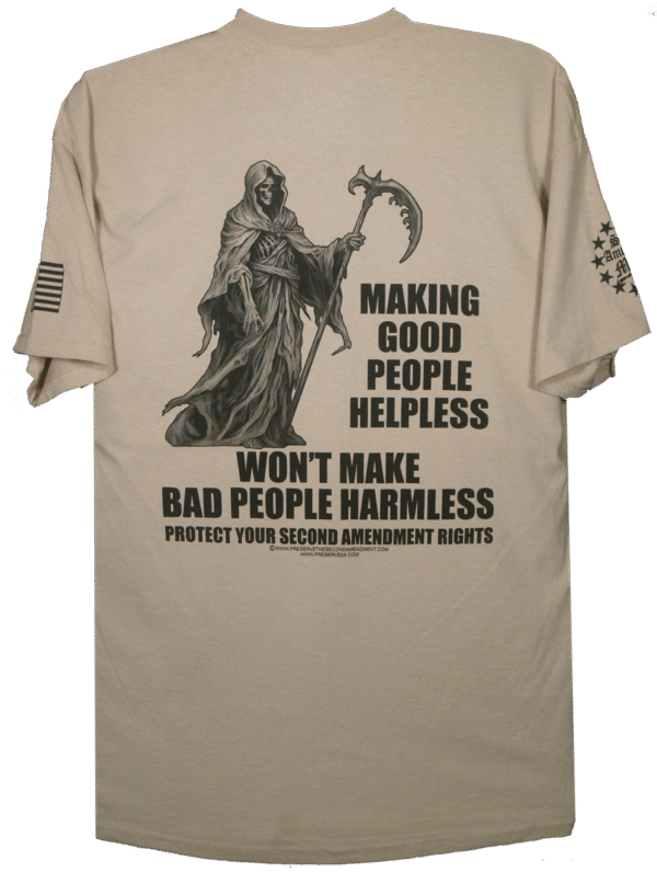 What message this t-shirt is trying to convey: that taking guns away from decent, law abiding citizens, will not make anyone any safer. In fact it will make them worse off because the “bad people”, will still have their guns. They will not give up their guns and as a result, they will be even more dangerous because the good people will have been disarmed and now unable to protect themselves or their families. That is why it is so important that we protect our right to bear arms.