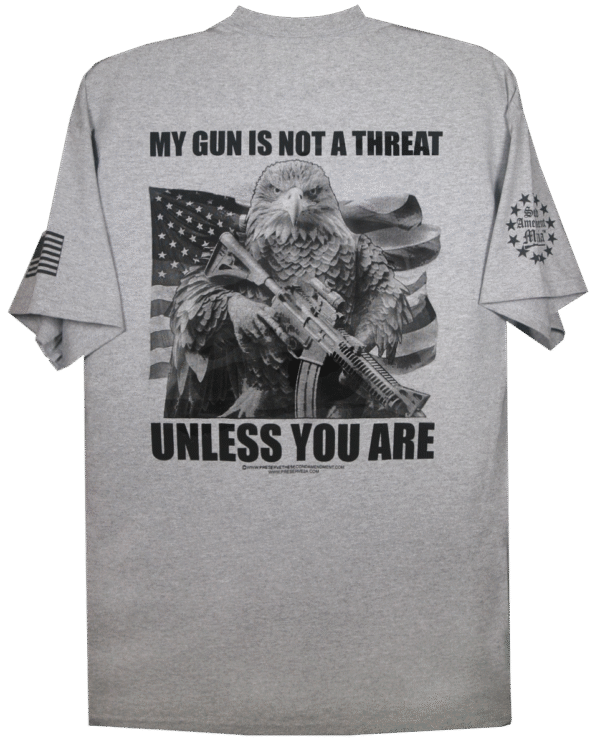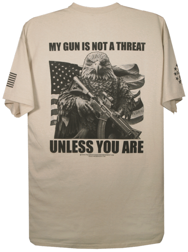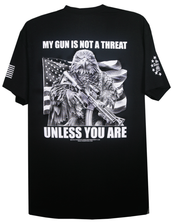 This T-Shirt Features a Big And Bold Bald Eagle with his AR at the ready. Behind him is an American Flag representing our great country. Above the graphic are the words: “MY GUN IS NOT A THREAT”, and below the graphic are the words: “UNLESS YOU ARE”. True Patriots are peace loving people, but won’t allow their Second Amendment rights be threatened. There comes a time when all true Patriots, amd believers of Freedom, must stand up for their rights. The Second Amendment gives them the means to stand up for their rights. That is why our founding fathers made sure the Second Amendment was included in the Bill of Rights, and therefore the Second Amendment to our Constitution.