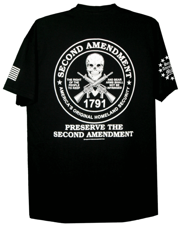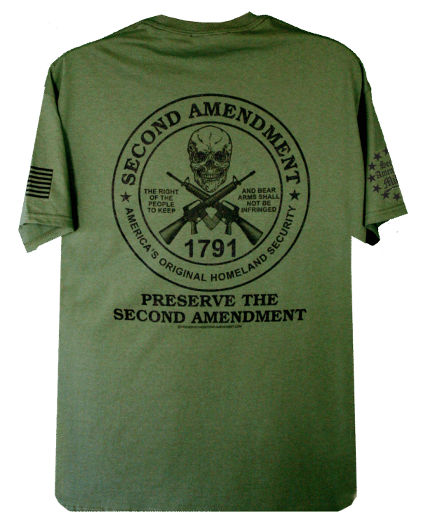 This bold design features a skull and a pair of crossed AR’s as part of this exciting circular graphic. The lettering around the circle read: “Second Amendment, America’s Original Homeland Security. Also within the corcular design it proudly reads: The right of the People to keep and bear arms shall not be infringed. as well as 1791, the year the Second Amendment was ratified. Below the circle, it boldly reads: Preserve The Second Amendment.