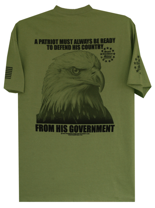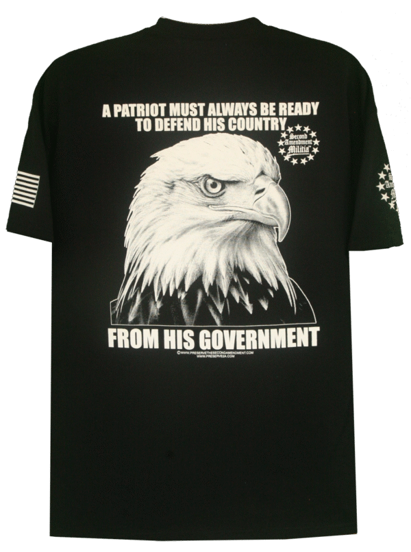 This T-Shirt features a beautifully drawn large American Bald Eagle Head in the foreground, and carries a unique message: “A Patriot Must Always Be Ready To Defend His Country From His Government”. A Patriot holds his country dear to him. Should the Government become tyrannicle, it is up to the people, usually made up of home-grown Patriots, to remove that tyrannical government. The t-shirt is simply a reminder that this may be necessary should the time come.
