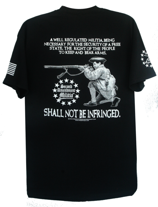 - PRINTED IN FOUR LOCATIONS: FRONT, BACK, AND BOTH SLEEVES, (PLUS A PRINTED NECK LABEL FOR COMFORT, FEATURING THE SECOND AMENDMENT MILITIA LOGO)