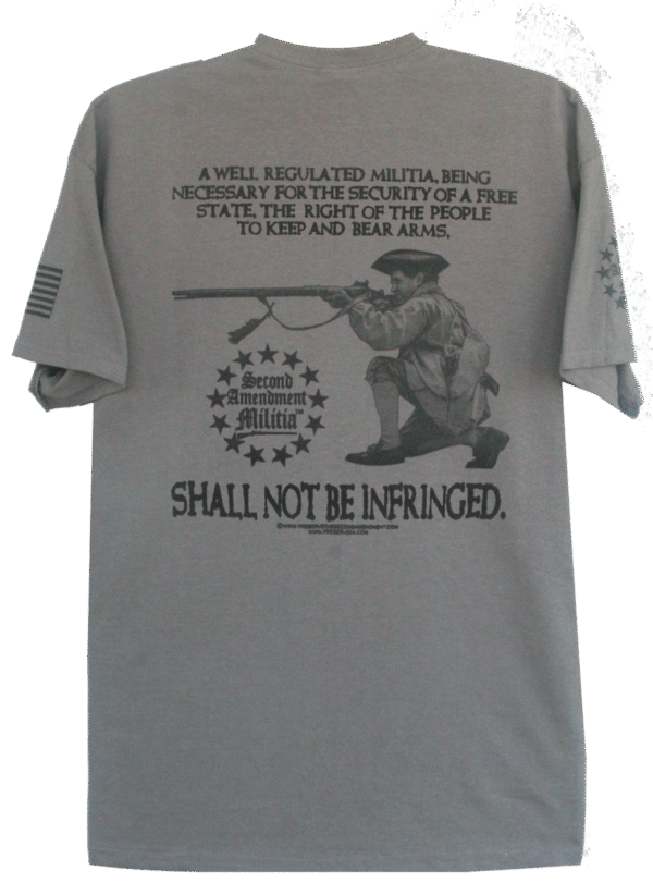 - PRINTED IN FOUR LOCATIONS: FRONT LEFT CHEST, BACK, AND BOTH SLEEVE. PLUS THERE IS A PRINTED NECK LABEL FOR COMFORT AND FEATURES THE SECOND AMENDMET MILITIA LOGO