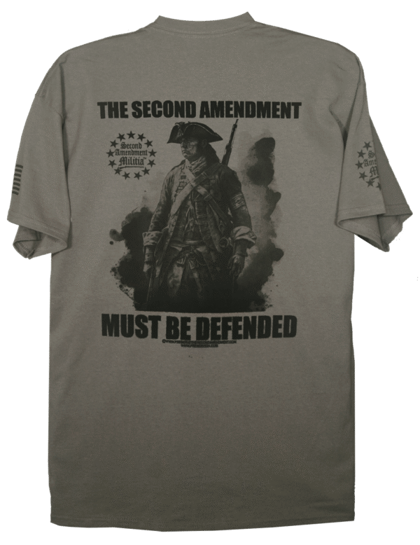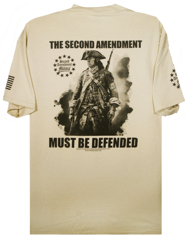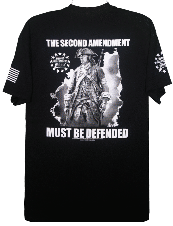 - PRINTED IN FOUR LOCATIONS: FRONT, BACK, AND BOTH SLEEVES, (PLUS A PRINTED NECK LABEL FOR COMFORT, FEATURING THE SECOND AMENDMENT MILITIA LOGO)