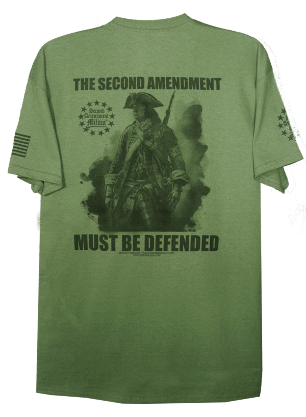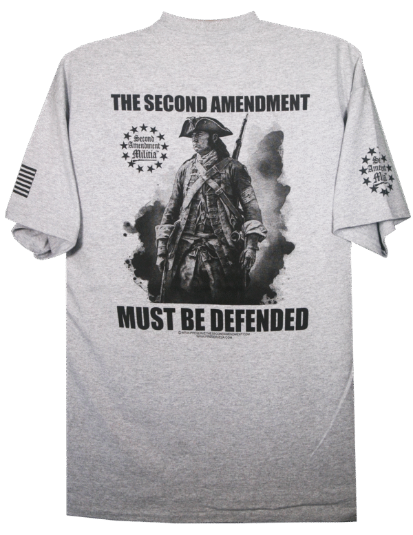 - PRINTED IN FOUR LOCATIONS: FRONT LEFT CHEST, BACK, AND BOTH SLEEVE. PLUS THERE IS A PRINTED NECK LABEL FOR COMFORT AND FEATURES THE SECOND AMENDMET MILITIA LOGO