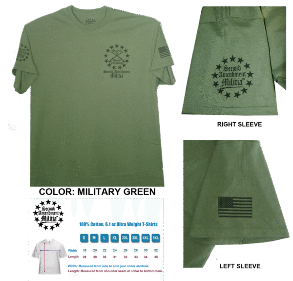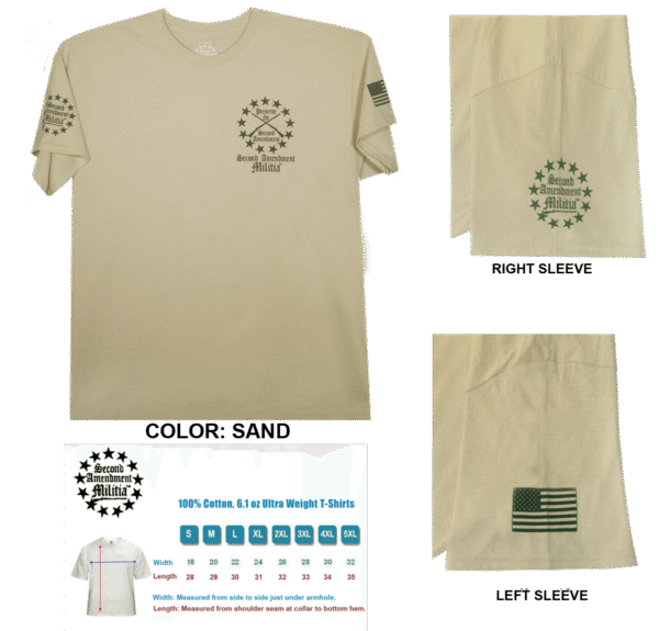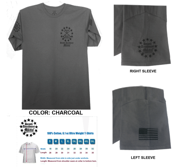 - Printed in 4 locations: Front left chest, back, and both sleeves, plus a printed neck label for comfort and features the Second Amendment Militia logo.