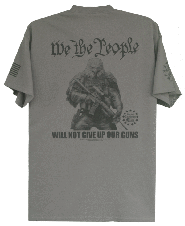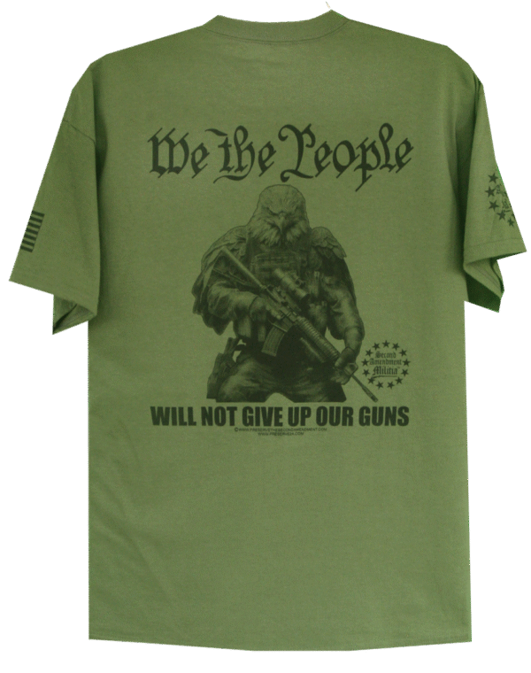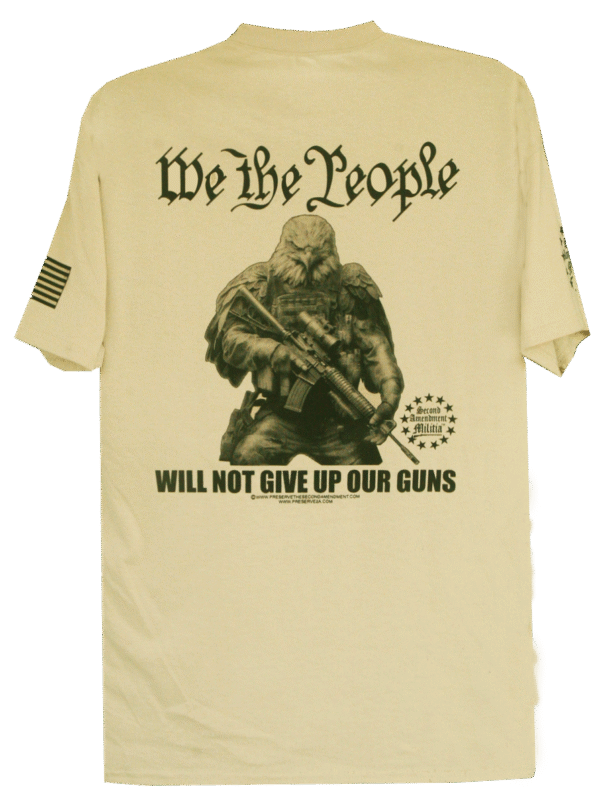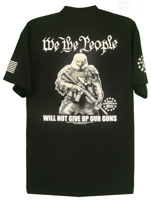 This creative design features a American Bald Eagle holding his AR at the ready. There is sheer determination in his eyes as looks forward ready to counter any threat. The Caption: “WE THE PEOPLE WILL NOT GIVE UP OUR GUNS” is a rallying cry from Patriotic Americans nationwide, that they are not about to have their firerms taken from them. This right is guaranteed by the Second Amendment, and We The People wil fight to preserve that right.