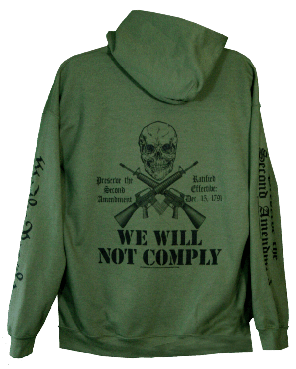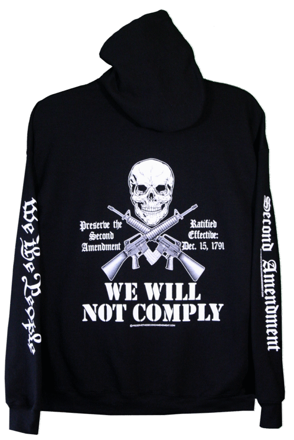 This Hoodie spells it out simply and clearly: “WE WILL NOT COMPLY”. This lets everyone know we are not giving up our Guns! We must “PRESERVE THE SECOND AMENDMENT”. This amendment was “RATIFIED EFFECTIVE DECEMBER 15, 1791” and is just as valid today as it was in 1791. We must: “PRESERVE THE SECOND AMENDMENT”! Say what’s on your mind with this expressive hoodie!