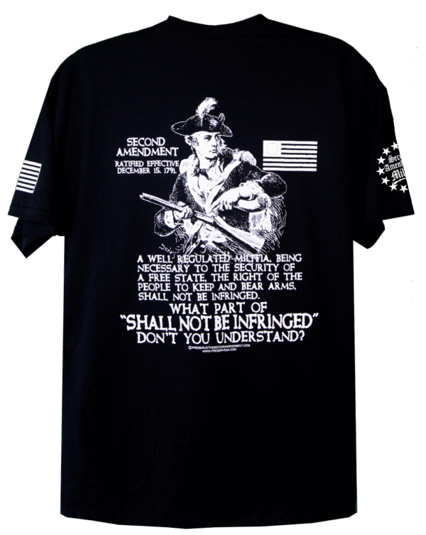 A excellent graphic of a traditional period Colonial Patriot Soldier adding gun powder to his musket coupled with all 27 words of the Second Amendment followed by: “WHAT PART OF “SHALL NOT BE INFRINGED” DON’T YOU UNDERSTAND? Design Includes Date of Ratification of the Second Amenment and a period 13 Star American flag, often referred to as the Betsy Ross Flag. A beautiful T-Shirt with an important message.